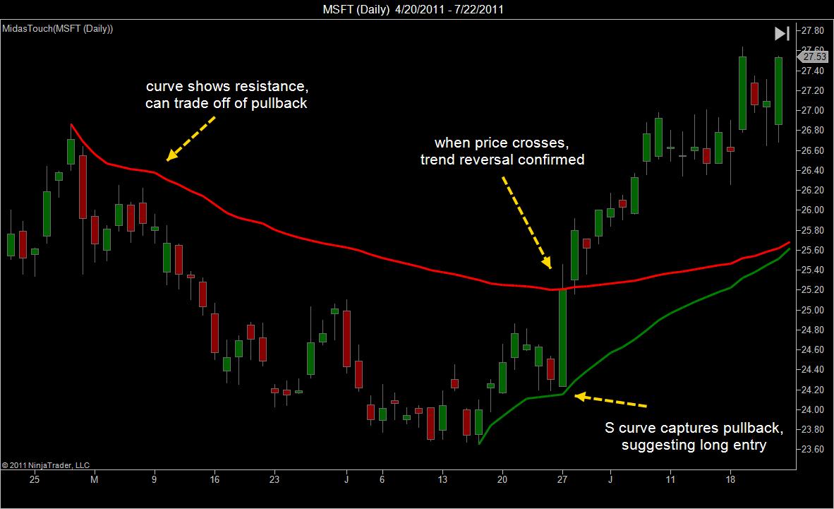 Midas Touch provides standard MIDAS S/R curves for NinjaTrader and MultiCharts, which can be configured with point and click. MIDAS curves provide powerful support and resistance, where price will often bounce. If price penetrates the curve, it's a good indication that a trend change has begun.